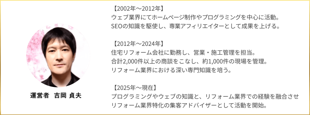 この記事は、リフォーム業界歴12年・商談2,000件以上・現場管理1,000件以上の実績を持つ、リフォームの匠スタジオ管理人・吉岡が監修しています。